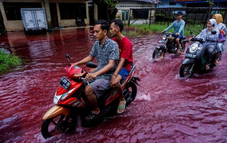 Bizarre scenes followed as children and people on motorbikes waded through the crimson waters, like a scene from an apocalyptic horror movie.