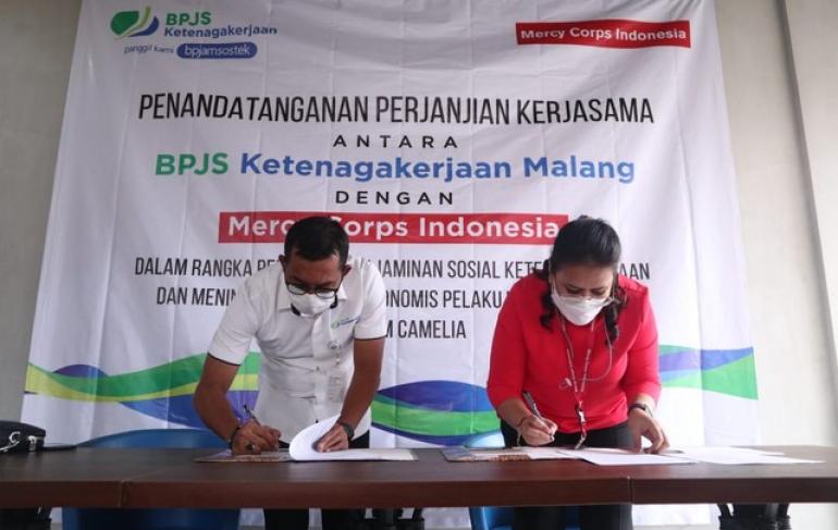 MALANG - BPJS Ketenagakerjaan dan Mercy Corps Indonesia (MCI), Non Govermental Organization (NGO), melakukan penandatangan Perjanjian Kerja Sama (PKS), Senin (14/2/2022). Perjanjian kerja sama itu dalam rangka edukasi terkait pentingnya perlindungan jaminan sosial ketenagakerjaan, dan mendorong pemberdayaan perempuan pengusaha.