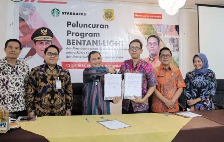 KBRN, Medan: Pemerintah Kabupaten (Pemkab) bersama dengan Yayasan Mercy Corps Indonesia (YMCI) dan Starbucks Foundation melakukan penandatangan kesepakatan bersama (MoU) dalam rangka peluncuran Program BENTANI Light yang digelar di Aula Kantor Bappeda, Kabupaten Dairi, Jumat (12/7/2024).