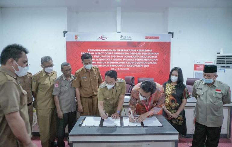 SIGI, MERCUSUAR – Pemerintah Kabupaten (Pemkab) Sigi dalam hal ini, Bupati Sigi, Moh. Irwan dan Executif Director Mercy Corps Indonesia, Ade Soekadis, melakukan penandatanganan kesepakatan kerjasama program Mercy Corps Indonesia dengan Pemkab Sigi, serta lokakarya kolaborasi program mengelola risiko melalui pengembangan ekonomi, untuk mendukung ketangguhan dalam menghadapi bencana di Kabupaten Sigi, bertempat di Aula Kantor Bupati Sigi sementara, Selasa (12/7/2022).