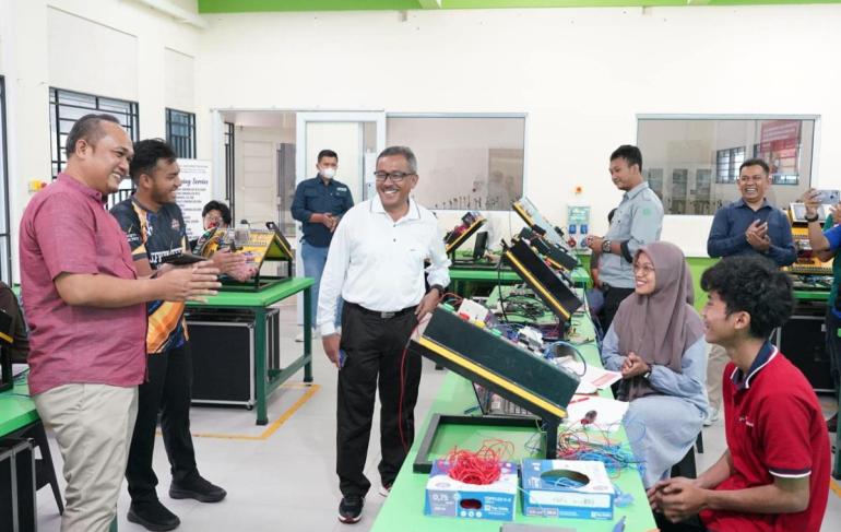 MC Pemko Batam – Wali Kota Batam, Muhammad Rudi diwakilkan oleh Sekretaris Daerah Kota Batam, Jefridin, M.Pd. meninjau pelaksanaan Pelatihan Fiber Optik Berdasarkan Unit Kompetensi Berbasis Literasi Digital Teknologi Bagi Pekerja Industri Mikro Kecil (IMK) di SMKN 1 Batam, Minggu (10/09/2023).