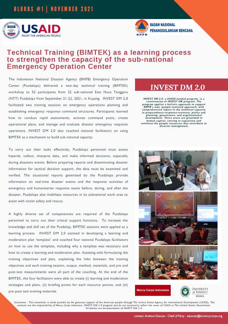 Adaptasi Perubahan Iklim dan Pengurangan Risiko Bencana Blurbs - November 2021 - English Bahasa Dokumen : Inggris 27 January 2022 / Comments Dikirim oleh admin pada 27 January 2022 File Download (Right click - Save link as.. for direct download) Blurb 01_Pusdalops Bimbingan Teknis NTT-04_AD-ENG-FINAL.pdf (2.02 MB)