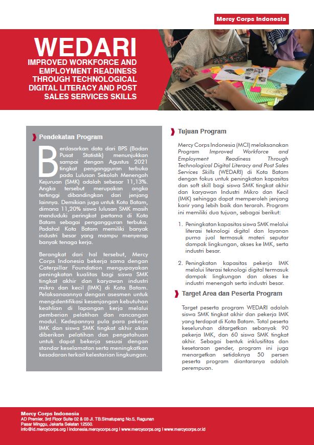 Meningkatkan Pemberdayaan Ekonomi One Pager - Program WEDARI Bahasa Dokumen : Bilingual 3 August 2022 / Comments Dikirim oleh admin pada 3 August 2022 File Download (Right click - Save link as.. for direct download) One Pager_WEDARI IND-ING.pdf (924.26 KB)