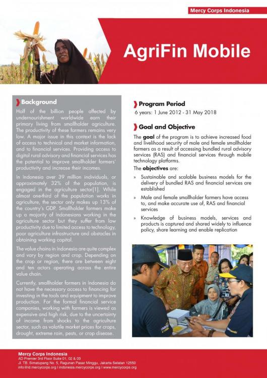 Mercy Corps Indonesia has an extensive understanding of the various needs of farmers, farmer groups, and other agricultural value chain actors, particularly in areas where mobile technology can be utilized to generate positive impacts on livelihoods and income. The Agri-Fin Mobile program has developed partnerships that bring together expertise, technology, infrastructure and products to establish bundled service models for corn farmers in Sumbawa, which will help improve their productivity and incomes. Services offered include information services such as weather data, market pricing, and crop tips, along with financial services such as value chain payments, loans, micro-insurance, and savings.