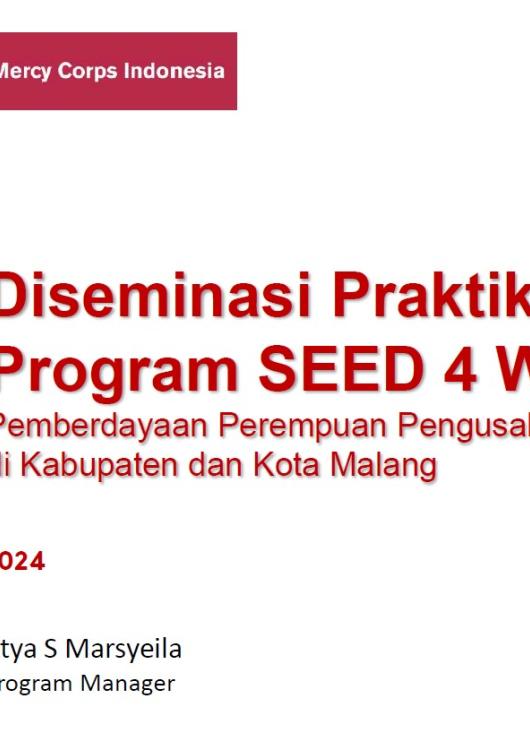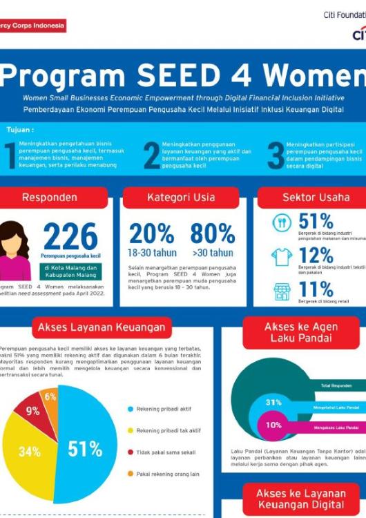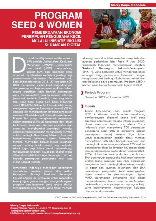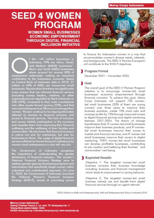 Tujuan keseluruhan dari inisiatif Program SEED 4 Women adalah untuk mendorong pemberdayaan ekonomi usaha kecil yang dipimpin perempuan melalui inklusi keuangan. Untuk mencapai tujuan ini, Mercy Corps Indonesia akan mendukung 750 perempuan pengusaha kecil (20% di antaranya adalah perempuan muda) selama tiga tahun untuk meningkatkan praktik bisnis mereka, menciptakan 10% lebih banyak pekerjaan dan meningkatkan keuntungan sebesar 15% melalui peningkatan akses ke layanan keuangan digital dan pendampingan digital dalam jangka 2021- 2024. Hal ini berdasar pada teori perubahan: JIKA perempuan pengusaha kecil meningkatkan praktik bisnis mereka; dan JIKA perempuan pengusaha kecil meningkatkan akses mereka ke pasar dan layanan keuangan; dan JIKA perempuan pengusaha kecil meningkatkan akses mereka ke pendampingan digital, MAKA perempuan pengusaha kecil dapat mengembangkan bisnis yang menguntungkan, berkontribusi pada penciptaan lapangan kerja serta meningkatkan kesejahteraan keluarga dan komunitas mereka.