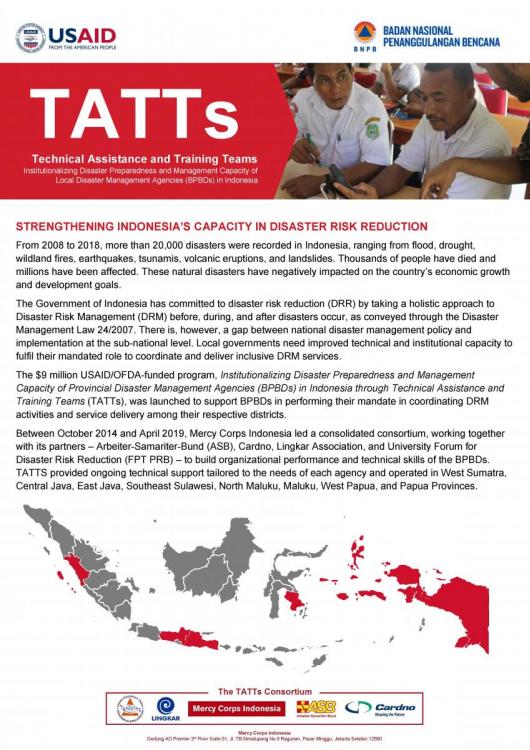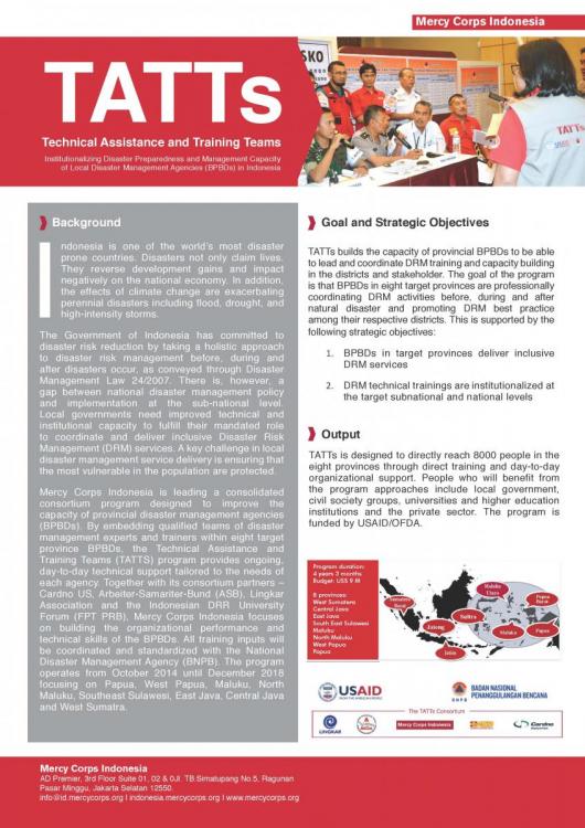 Mercy Corps Indonesia mengkoordinasikan sebuah konsorsium yang dibentuk untuk meningkatkan kapasitas lembaga-lembaga penanggulangan bencana di tingkat provinsi (BPBD). Dengan menanamkan tim ahli penanggulangan bencana dan pelatih yang berkualitas pada BPBD di delapan provinsi sasaran, Program Technical Assistance and Training Teams (TATTs) menyediakan dukungan teknis berkesinambungan yang disesuaikan dengan kebutuhan masing-masing BPBD. Bersama dengan mitra konsorsium – Arbeiter- Samariter-Bund (ASB), Perkumpulan Lingkar dan Forum Perguruan Tinggi Pengurangan Risiko Bencana (FPT- PRB), Mercy Corps Indonesia fokus pada membangun kinerja organisasi dan keterampilan teknis BPBD. Semua pelatihan akan dikoordinasikan dan distandardisasikan dengan Badan Nasional Penanggulangan Bencana (BNPB). Program ini berjalan dari Oktober 2014 hingga Desember 2018 yang berfokus di Papua, Papua Barat, Maluku, Maluku Utara, Sulawesi Tenggara, Jawa Timur, Jawa Tengah dan Sumatera Barat.